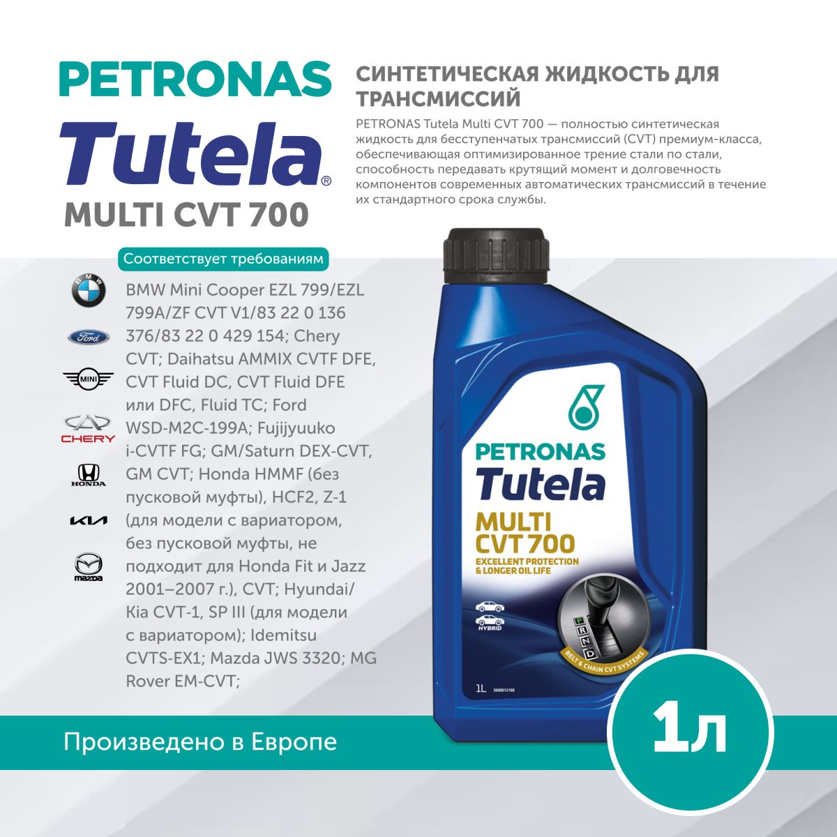 PETRONAS Tutela Multi CVT 700 — полностью синтетическая жидкость для бесступенчатых трансмиссий (CVT) премиум-класса, обеспечивающая оптимизированное трение стали по стали, способность передавать крутящий момент и долговечность компонентов современных автоматических трансмиссий в течение их стандартного срока службы. Широкий охват спецификаций основных производителей, обширные стендовые и полевые испытания делают его пригодным для использования практически со всеми трансмиссиями CVT. По этой причине Tutela Multi CVT 700 снижает риск использования неподходящего масла и упрощает управление запасами автопарков и станций технического обслуживания.